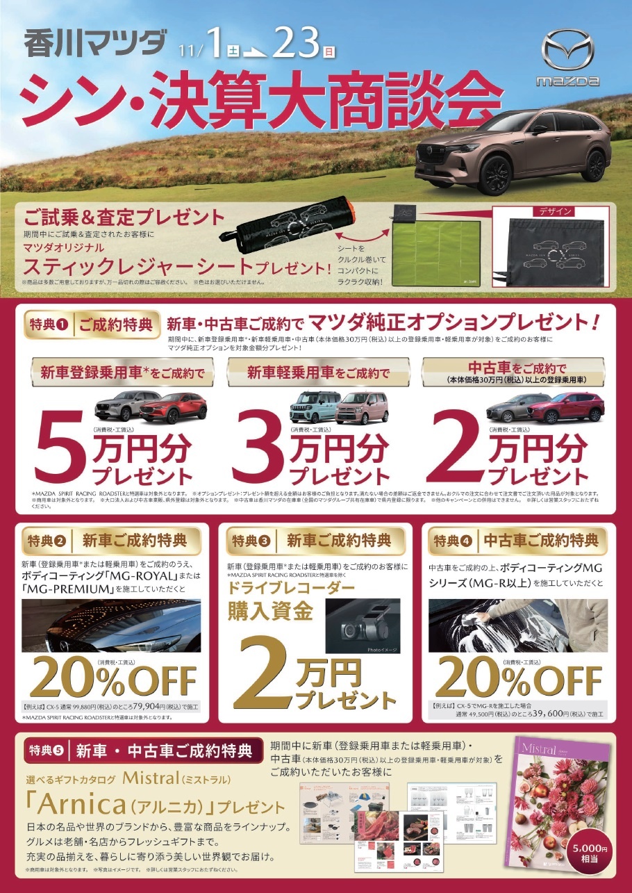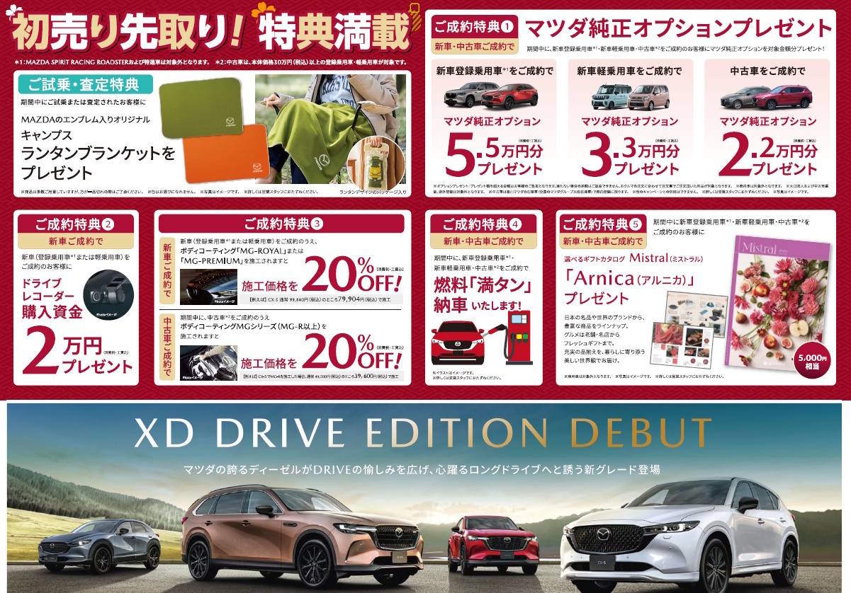 期間中に新車・中古車(本体価格30万円(税込)以上の登録乗用車・軽乗用車が対象)をご成約頂くと選べるカタログギフトとマツダ純正用品対象金額分とマツダボディコーティング(新車・中古車)及びドライブレコーダー(新車のみ)をお得にご購入できる特典付。